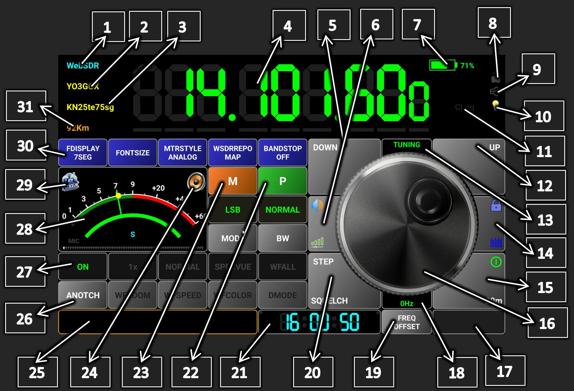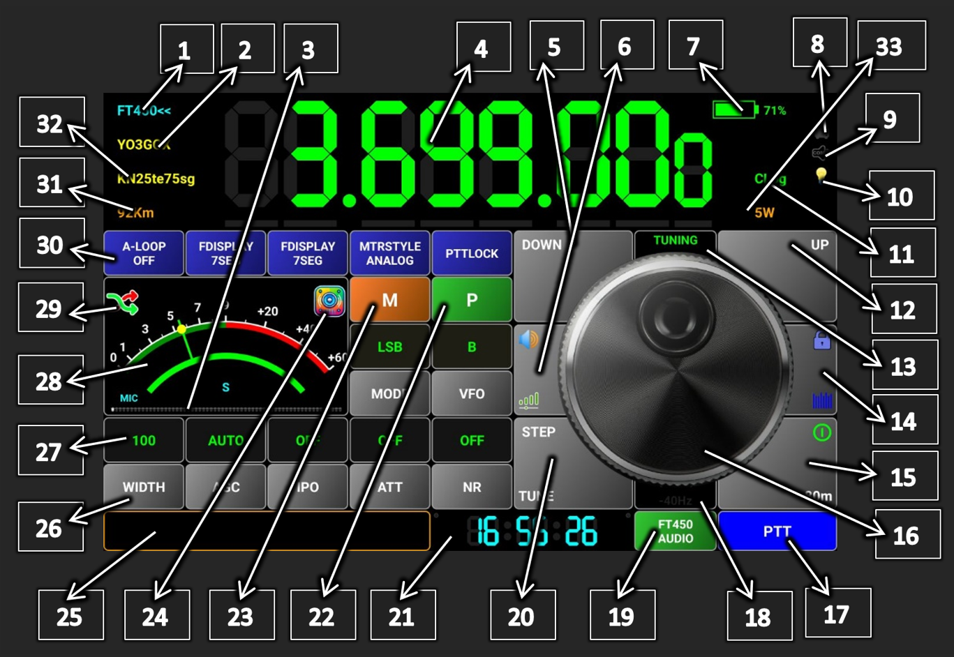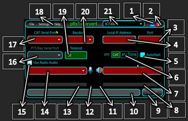 · The ON/OFF button connects or disconnects the application from the remote server or locally connected transceiver.